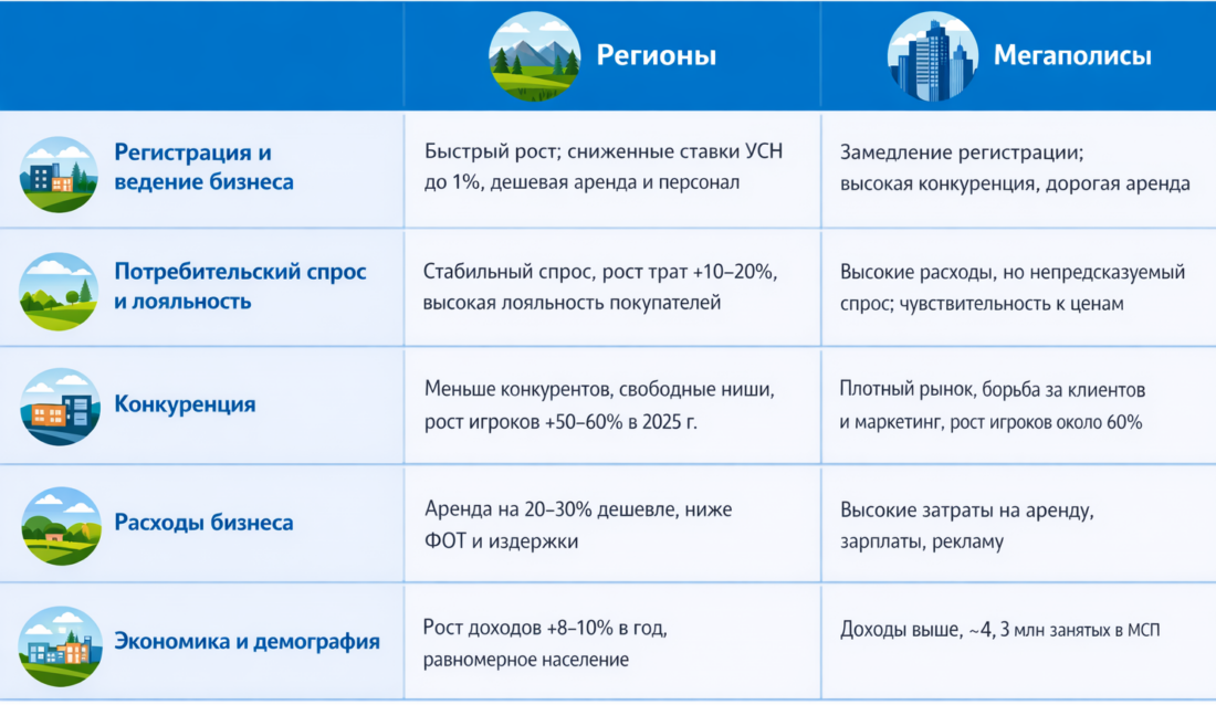 Для малого бизнеса это означает, что условия для старта и стабильного ведения деятельности в регионах часто менее рискованны, а возможные дополнительные расходы на логистику и маркетинг компенсируются более предсказуемыми расходами на аренду и персонал.