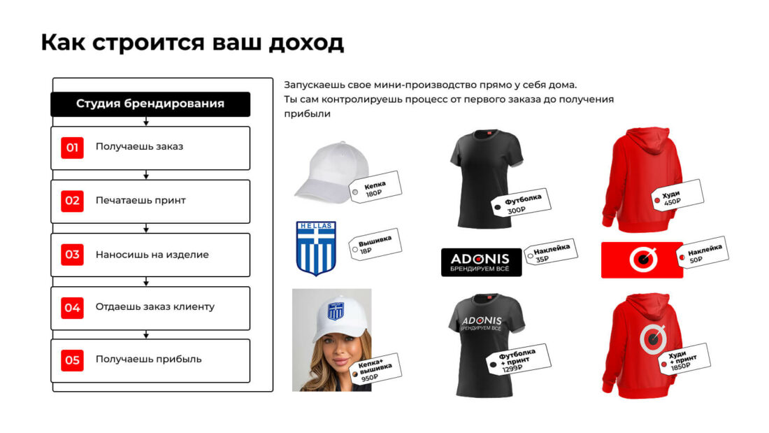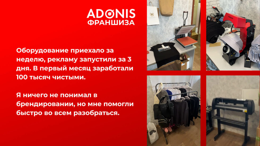 Франшиза Adonis позволяет открыть бизнес по производству брендированной продукции: работать с оптом, розницей или продавать свой бренд одежды через соцсети. Гарантируем первые заказы за 14 дней по уникальной системе!