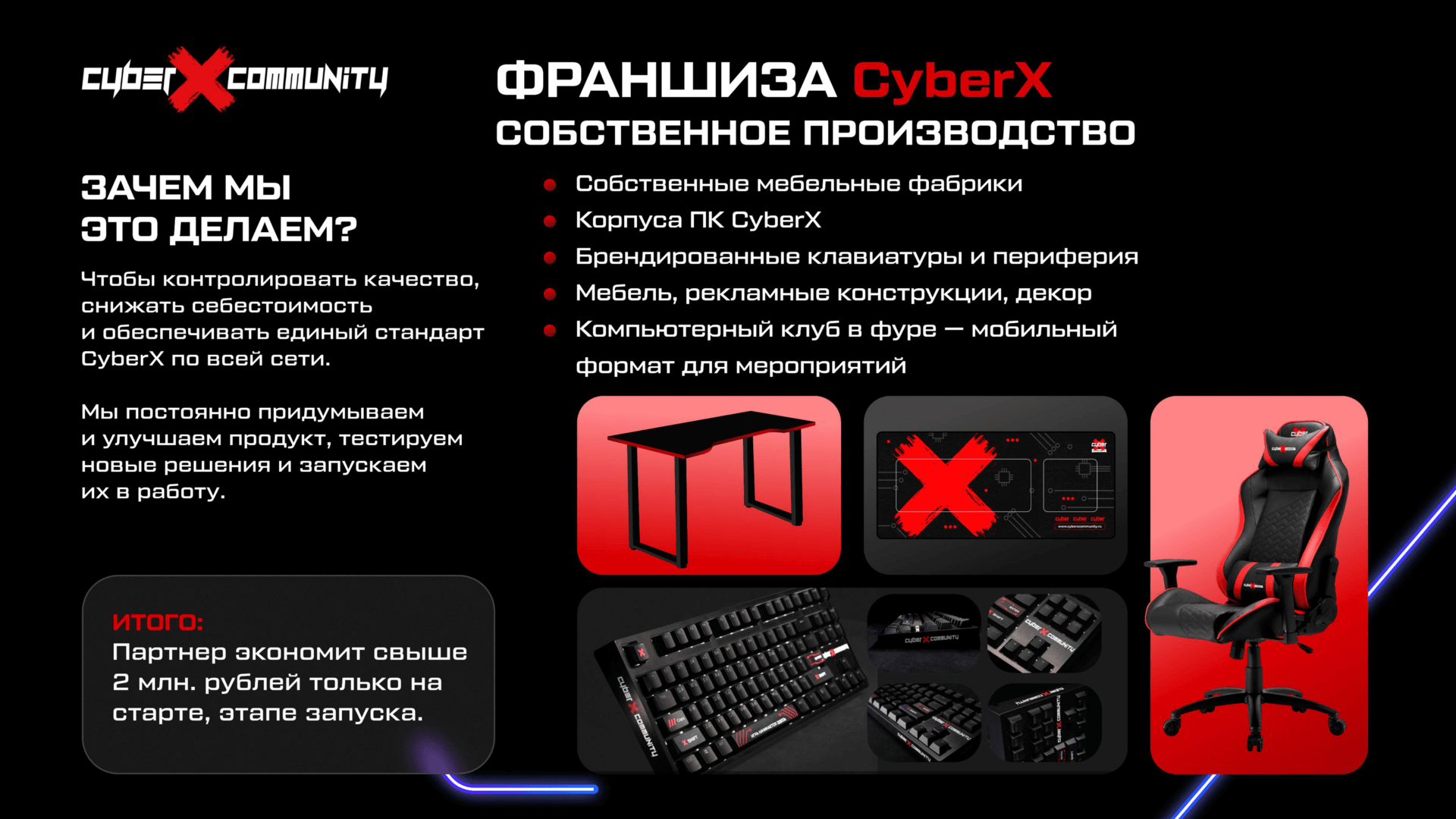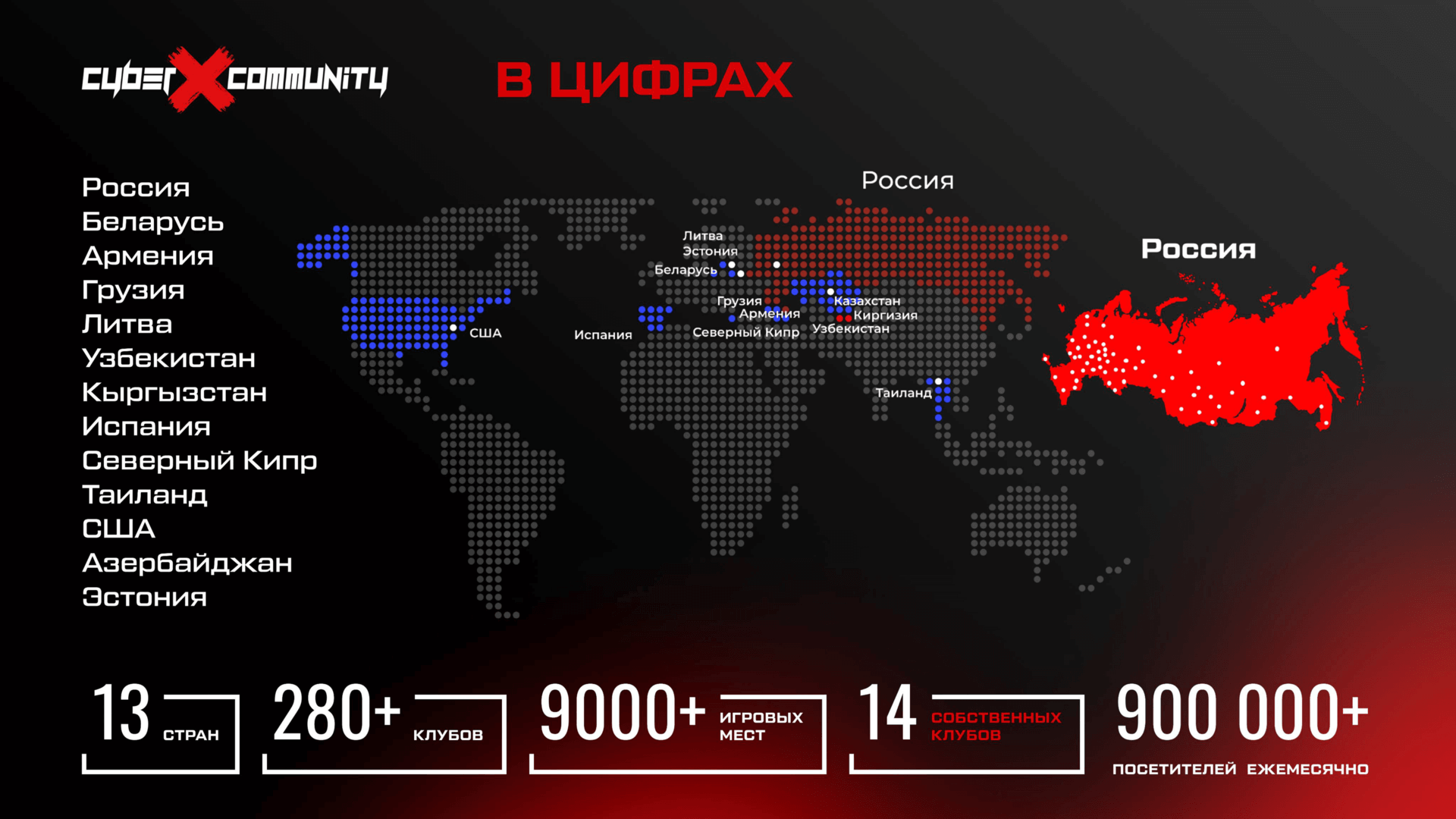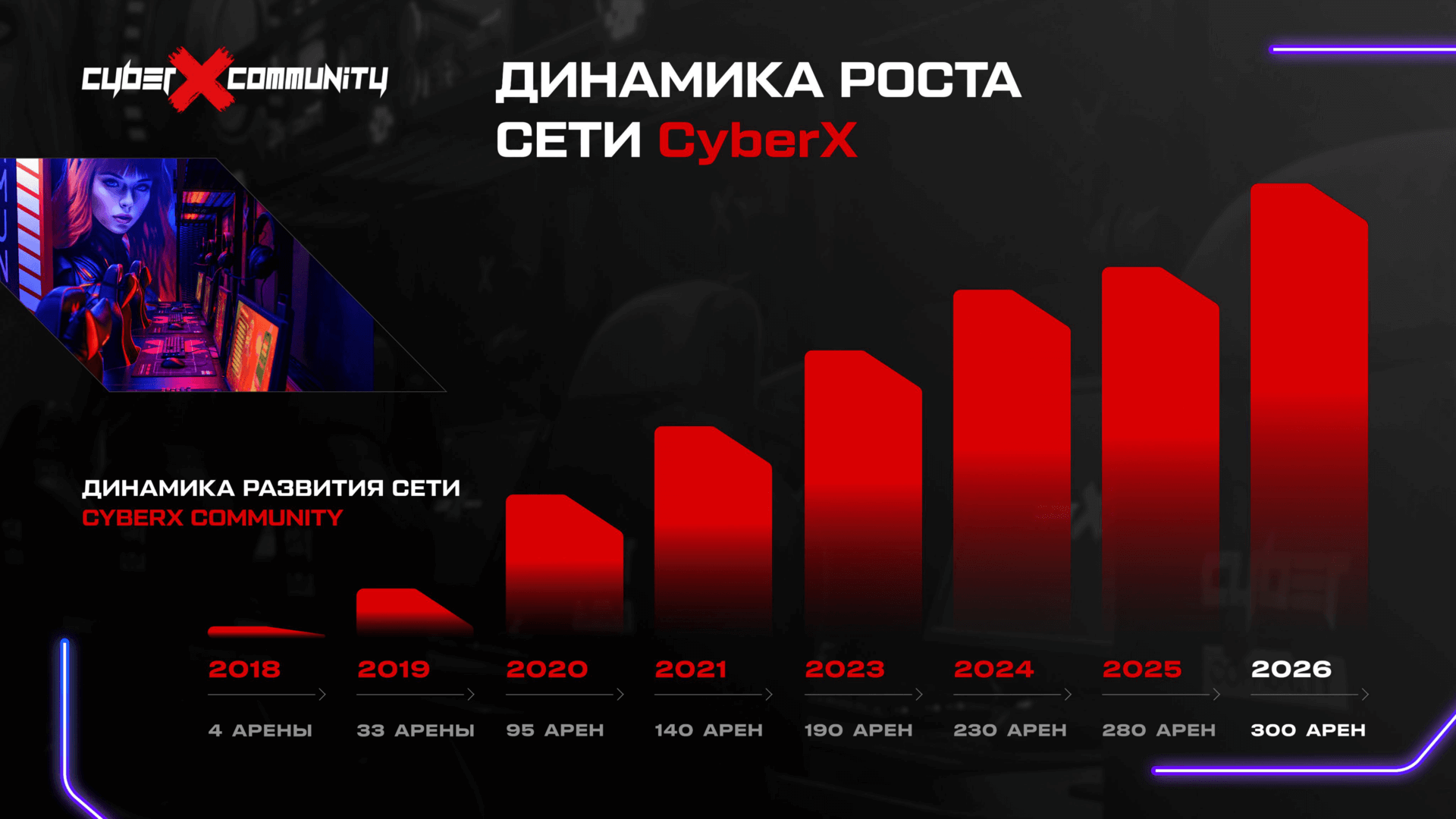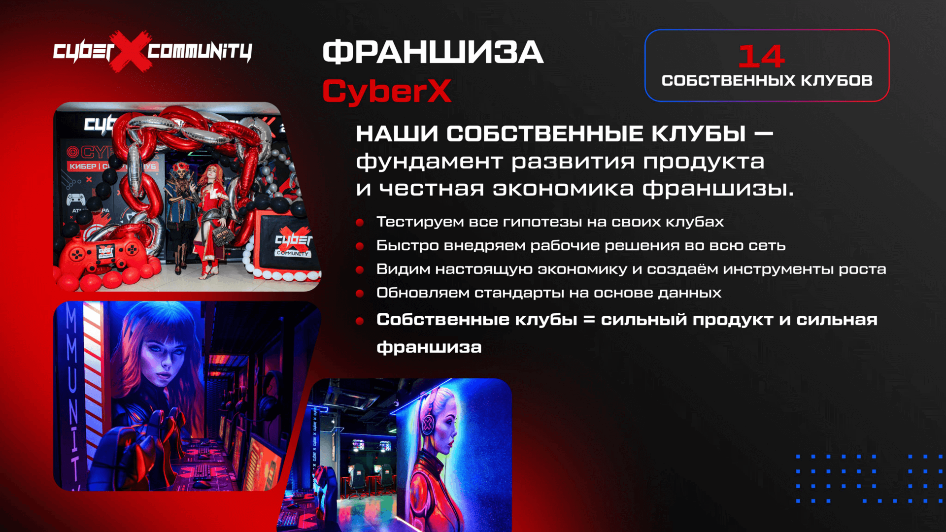 - Единые стандарты сети, протестированные в собственных клубах CyberX и внедрённые во всех партнёрских проектах.